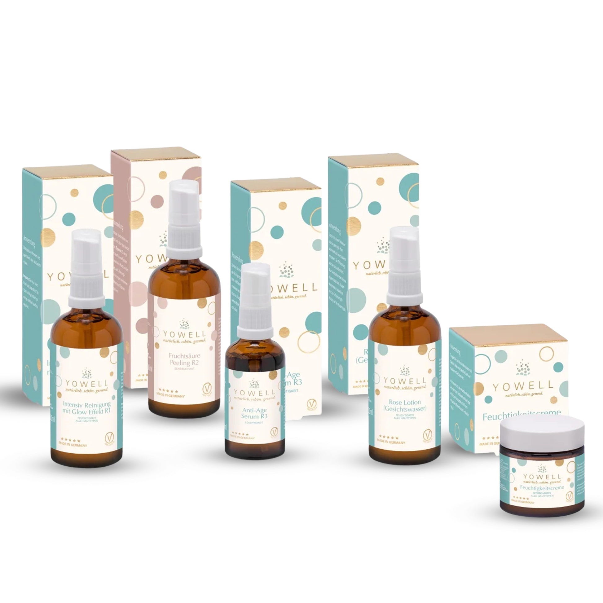 Intensive Reinigung mit Glow Effekt R1, Fruchtsäure Peeling R2, Anti-Age Serum R3, Rose Lotion (Gesichtswasser) und die Feuchtigkeitscreme Hydro Aktiv.